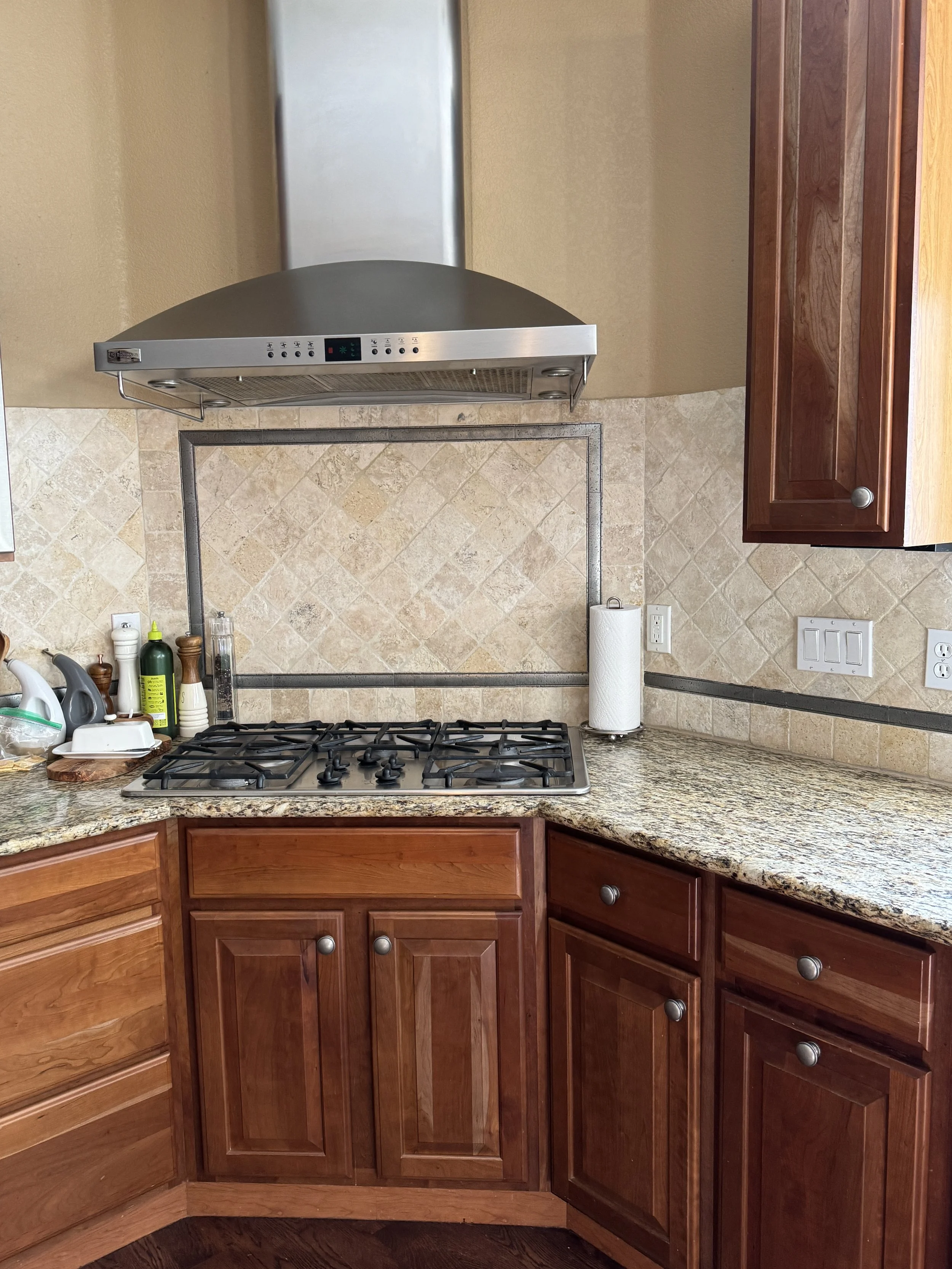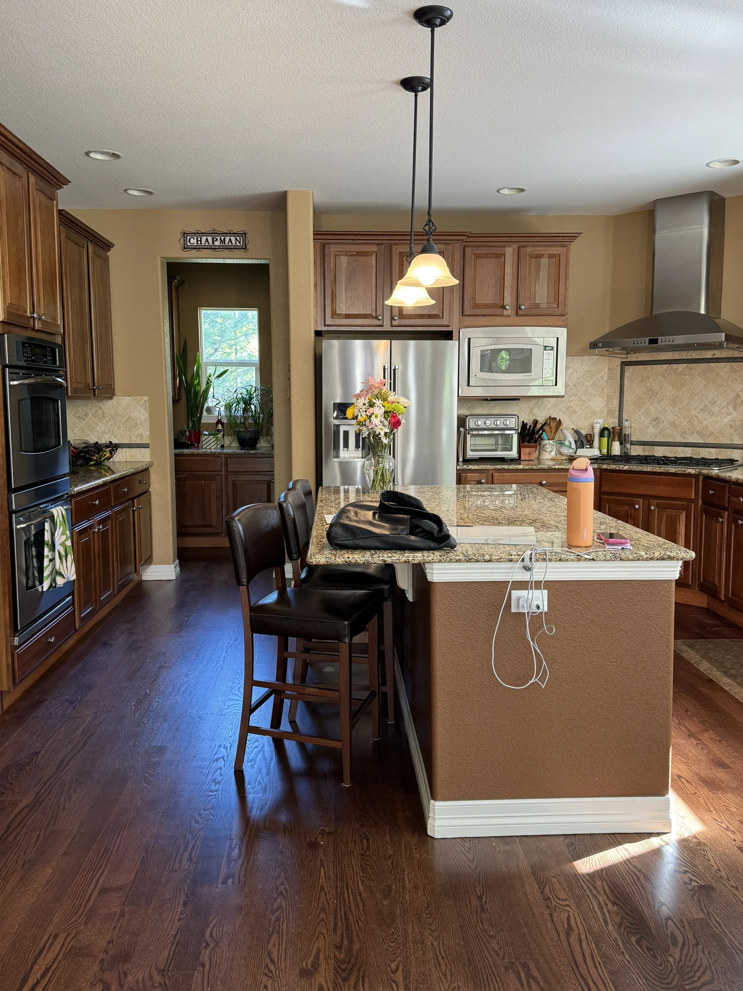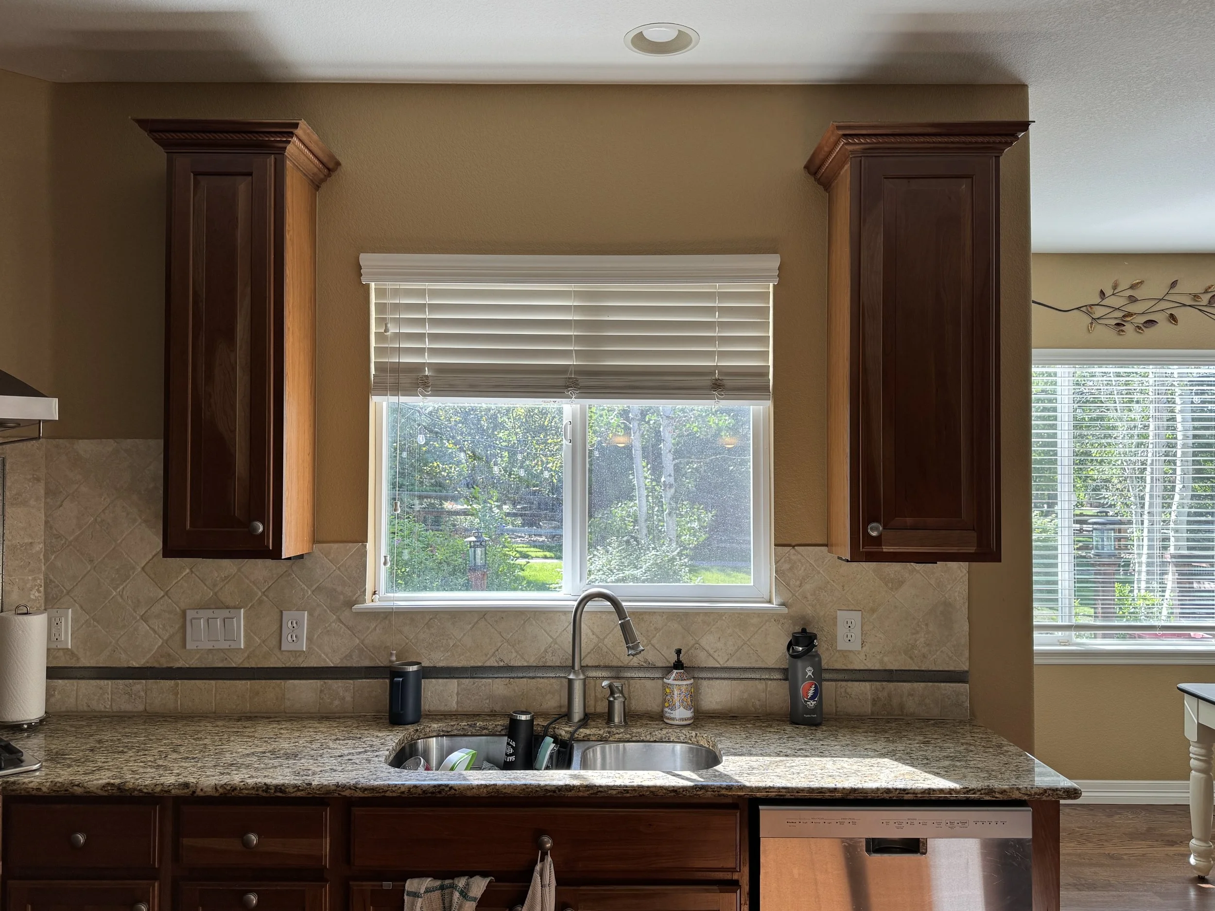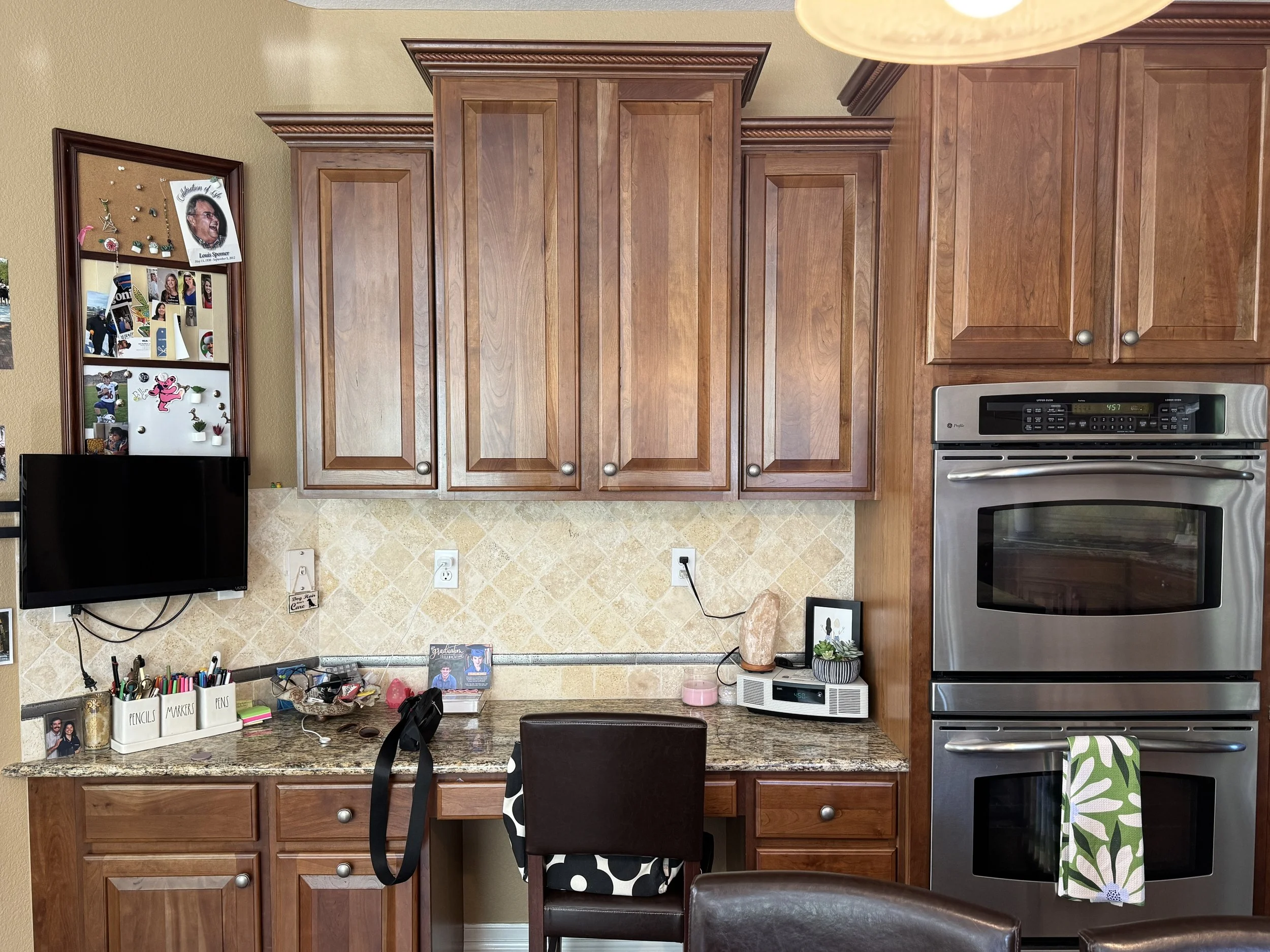 Update an early-2000s “Olive Garden-core” kitchen to represent the beautiful nature of two retired teachers who love seaside natural materials.